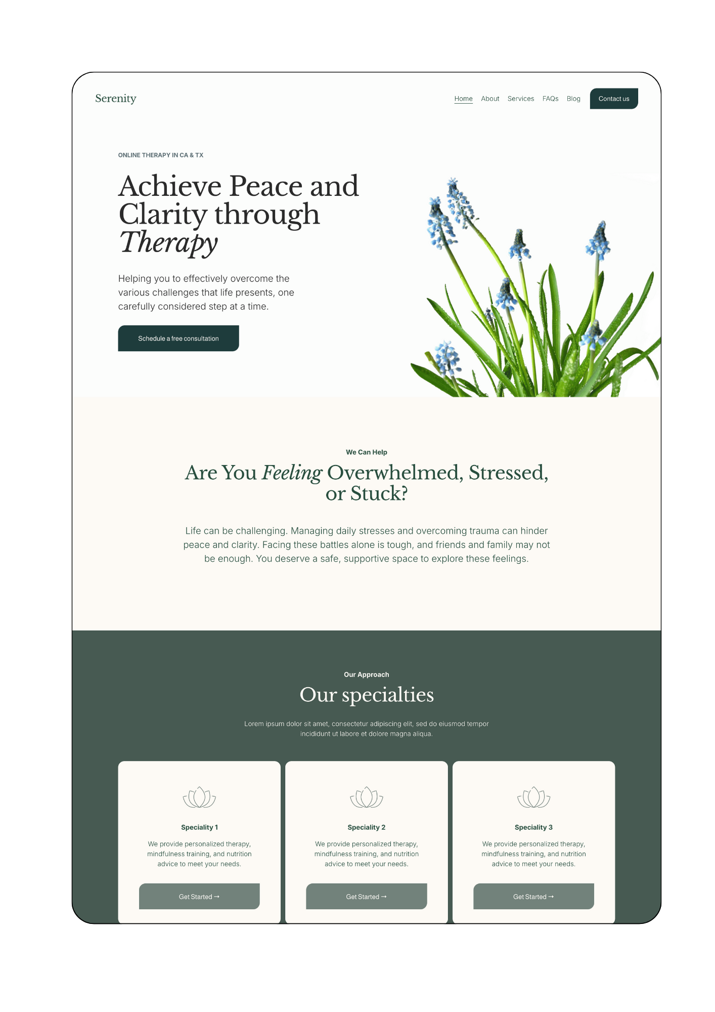 Clarity is perfect for therapists who want a modern yet simple design. With large headings, strategic white space, and call-to-action buttons, it helps clients find the information they need quickly.